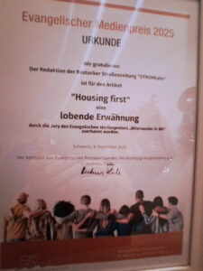 Der Rostocker STROHhalm erhielt eine lobende Erwähnung samt Urkunde. Passend zum 30-jährigen Jubiläum würdigt der EPMV damit das Engagement der Straßenzeitung für jene, die es schwerer haben als andere. Wir sagen herzlichen Dank für diese Anerkennung!