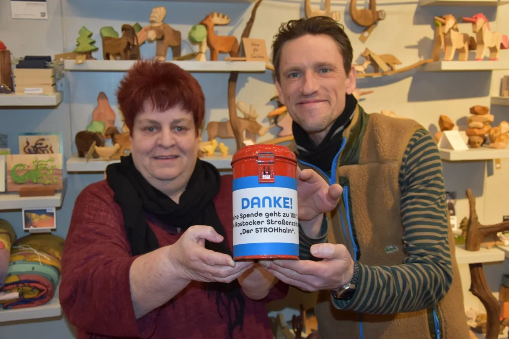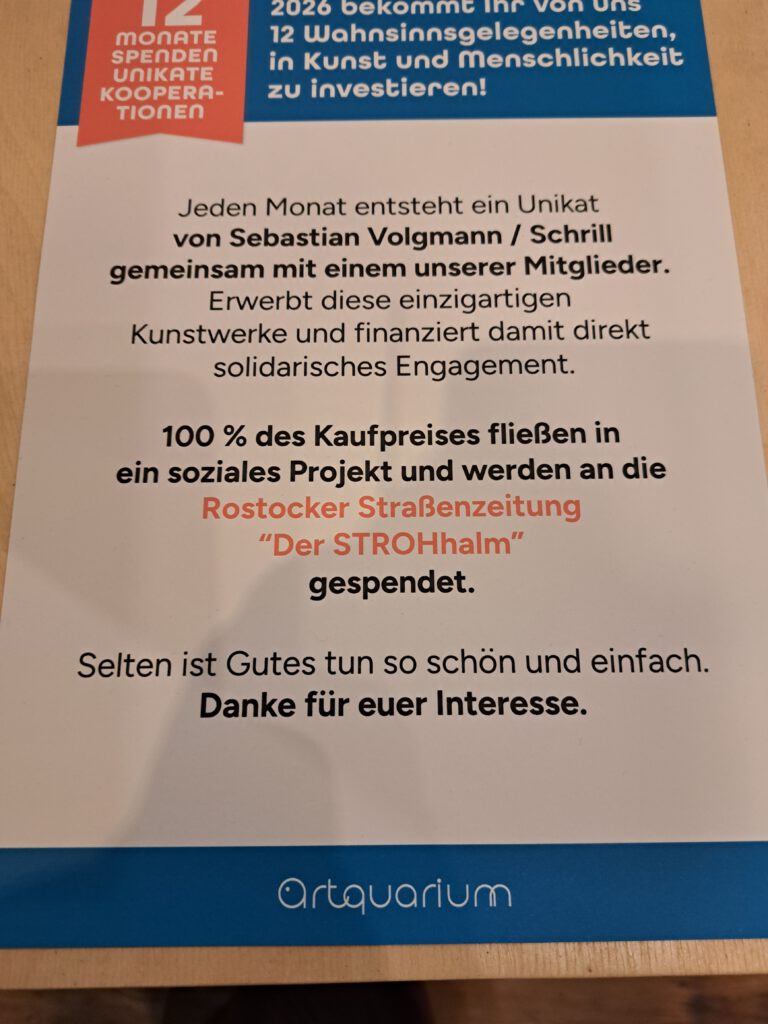 Die Produzentengalerie Artquarium hat eine Spendenaktion für bedürftige Menschen in Rostock ins Leben gerufen. Mit Herzenswärme und Kreativität wird jeden Monat in 2026 ein Unikat für den guten Zweck verkauft. Den gesammelten Erlös erhält die Rostocker Straßenzeitung STROHhalm.
